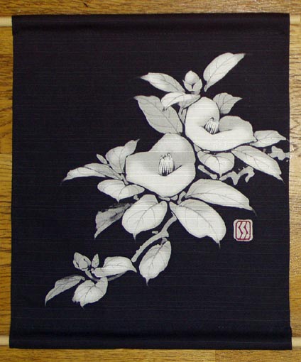 雨の日が続く12月。雪よりはいいけど。先日、母親の部屋の敷居が朽ち果てて「げっ!シロアリかっ!?」と慌てて大工さんに見てもらったのだが、幸いなことに敷居の木の性分が悪かったらしく、それ一本だけが朽ちていて土台などに問題はなかった。大工さんが来たついでに母親が他の直すところも追加して、今朝方から新たな作業に取りかかることになり、私の今日の予定は完全に崩れた(--;今年のうちに済ませたい仕事というのが、それぞれの思惑にある。・・・私にもあるんだが(^^;写真はミニタペストリー「椿」 木綿にローケツの草木染め。生地に乗せるローを温度や筆さばきのスピードで加減し、染め上げたときに白くなる部分と染料が染み込む部分を描き分ける。これも地震で壊れた事務所から慌てて持ち出したもの。いまだに当時の資料や図案が整理されておらず、今日も追加が来た帯の図案を写真データを見て描きなおしていると宅配便や集金人が次々と来る。そして今日も雨が降り続く・・・今年のうちに屋根を完全に直し切りたい!(--;)うぅぅ・・・実に落ち着かない日々だ。