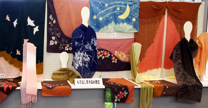 穴水町の夏のイベント、長谷部祭りにあわせて穴水公民館の作品展が開催中。『もろはし草木染め教室展』、他のグループの絵画や書道なども展示している。21日(月)午前まで。午後2時から搬出。手描き、手染め、手絞りの草木染め教室も活動が20年近くになり最高齢が83歳とかになって、メンバーも様変わり。60才代の人が中心となった皆さん、手絞りの模様やぼかし染めに頑張ってます(^^)今回は絞りの形を美しく染め出すということがテーマ。草木染めに絞りを重ねて更に色を重ねて、美しく模様を染め上げる♪色は重ねるほどに、美しくなる!60歳代の私も参加・・・ヤシャブシの実を煮出して染めた黒に絞りと手描きを施した絹ストール。藍染めロウケツ描きは家の周りの夏草がテーマ・・・実際は、もっと激しく生え放題で困っている(笑昨日は、偶然にも熊本県から家族旅行の親子が、検索で工房を見つけて見学を希望された。奥さんが草木染めを学んでいるとのこと。「染めムラが出るんです」というので、色は、浴比(繊維の重さに対する染め液の比率)を大きくして(工房では100倍ほど)丁寧に動かし染め重ねると、もっともっと美しくなるはずですと説明した・・・「藍染めは8回、黒は12回ほど染め重ねています」自然を使った染めは手間が掛かるのです、と。「教室の生徒さんも、これに近いほどの回数を染めています」(^^▼能登の手の日々 カテゴリー ●全て ●日々 ●街中ギャラリー ●染色 ●能登、そして、この町 ●絵・美術について ●CG ●食べもの ▼能登の手の作品集 (写真・CG) ▼リンク ●ようこそNotoNote オリジナルのデザイン・あつらえの着物。染色・草木染めの専門ページです。 ▼お気に入り ブログ・その他 ●Water-Colour ひろろdecさん ●紅の水絵日記 M-Crimsonさん ●MoMo太郎日記 MoMo太郎009さん ●Kleine Erfrischung kamoppieさん ●考え事ほか vissel-篤胤さん ●地元力向上委員会 hanami73さん ●今日の空 つるまる5さん ●Que sera sera 五右衛門0563さん ●染工房えむ koubou-mさん ●バンブーおじさん奮闘記 幸達さん ●てんてん日記 もえぎさん染色の専門サイト★能登の手へのメール