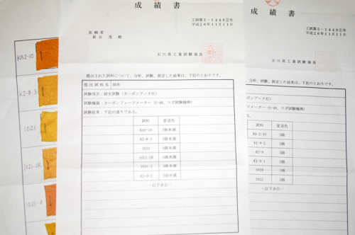 草木染めは難しそうなイメージがあるけれど、同じ条件であれば誰でもが同じ色に染めることができる。私と同じ方法で染めれば、初めての人でも誰でもが同じ色に染まる(^^身近な自然を使って楽しむこと、誰でもが同じく美しい色を染められるのは楽しいものだ。趣味の教室は楽しい~♪しかし、それを商品にする場合は意味が違ってくる。草木染めの販売を始めた頃「色褪せした」という声を聞いて、全て回収したことがある。色によっては光に弱く退色するものもある。摩擦で他の布に色移りするものもある。染め方にも因るし、色素自体が良くない場合もある。趣味で染めて身内や知人に売る場合は、買う方も共に理解して買ってもらえる。だが、不特定の人に売る場合は別だ。デパートや通販で買ってもらう場合や販売店経由では、作り手と売り手の責任が問われる。私の工房の今の最大の課題は、草木染めの色の「耐光堅牢度」と「耐摩堅牢度」を高めることだ。通販や百貨店の要望する基準値は化学染料で染めた堅牢度と同じような程度を求められる・・・ムリです・・・と言えば、そこで終わる。商取引も、そこで終わる(^^;専門の書物に堅牢と書いてあるとか実際に使用した範囲で大丈夫、等という説明をしても無駄だ。基準を通るのは工業試験場の試験結果であったり、専門の第3者検査機関による検査結果だけだ。石川県工業試験場で試験された草木染め。3級以下の内容もあるし3級より上の試験結果もある。化学染料の基準は自然の草木染めには当てはまらない、などという人もいるが、その理由が分からない。自然という名の隠れ蓑を着せて、責任の逃げ道を作っただけに思われる。それが販売店の検査基準を通らなければ採用されないだけ。・・・分かりやすくて良い(^^草木染めでも、光や摩擦に対する堅牢度はある程度までは高めることが出来る。もちろん、全てが可能とは思わないが、良い染料を採れる植物を選び良い染め方をする。そうした工夫を重ね手間を惜しまなければ検査基準をクリアして実用に耐えられる内容に染め上げることは出来る。ちなみに染料の販売店は「この植物は、こういう色に染まります」として売っているが、堅牢度を保証しているわけではない(^^;堅牢と表示されている有名なコチニール(ウチワサボテンにつく貝殻虫)なども、美しい紫やピンク色はビックリするほど耐光堅牢度が悪い(笑単に自然のものだから良いとか、人工的なものだからとか化学的な物質だから云々のイメージではなく、裏づけデータを明確に提示する、そうしたことも作り手の人間の責任ある姿勢だと思う。自然であろうが人工であろうが、使う人が良いと思えるクオリティの染めをしていきたい。(^^▼能登の手の日々 カテゴリー ●全て ●日々 ●街中ギャラリー ●染色 ●能登、そして、この町 ●絵・美術について ●CG ●食べもの ▼能登の手の作品集 (写真・CG) ▼リンク ●ようこそNotoNote オリジナルのデザイン・あつらえの着物。染色・草木染めの専門ページです。 ▼お気に入り ブログ・その他 ●Water-Colour ひろろdecさん ●紅の水絵日記 M-Crimsonさん ●MoMo太郎日記 MoMo太郎009さん ●Kleine Erfrischung kamoppieさん ●考え事ほか vissel-篤胤さん ●地元力向上委員会 hanami73さん ●今日の空 つるまる5さん ●Que sera sera 五右衛門0563さん ●染工房えむ koubou-mさん ●バンブーおじさん奮闘記 幸達さん ●てんてん日記 もえぎさん染色の専門サイト★能登の手へのメール