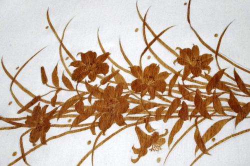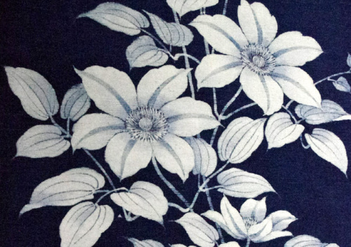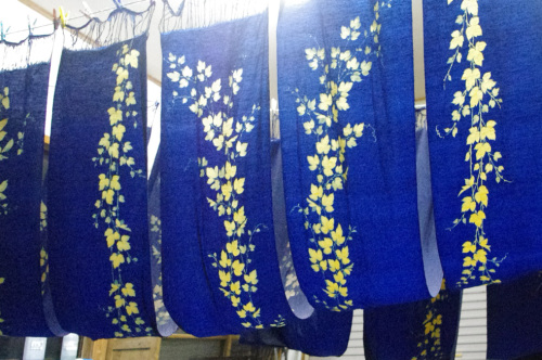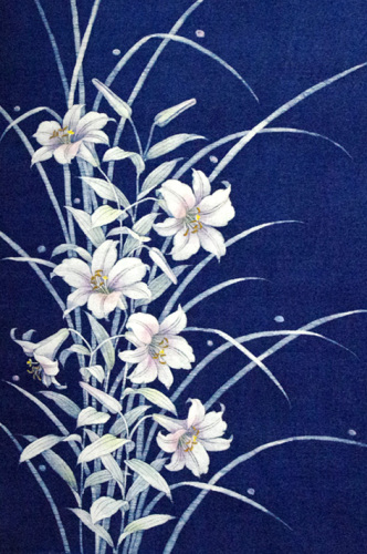 絵を描くことと意匠をデザインすることは違う。ということが、若い頃の私は分かっていなかった(^^;今、分かっているかといえば・・・だいたいかな~(笑絵は思い通り自由に描いて良い。意匠は目的に応じて工夫する。という極論。いや、売るための絵もあるし、ウケル為のデザインもある。どんな仕事でも思い通りにならないこと、苦しいこともあるから、それぞれ工夫はしている筈???いや、ちょっと違うかもしれない。が、私自身が時々陥る『ド壷』がある。ロウケツの作業が好きなので、リアル系統の模様のときに絵のような表現を目指し過ぎることがある。そして自分のクビを締める。絹ショール ササユリ模様 藍染め 顔料仕上げ今回の追加で苦しんだのは2点。模様の重なりが多くて複雑なこと。もう一点がユリの表情を描き分けようとして手間を掛けすぎたこと。少なくとも加工代金に見合った仕事ではなくなった(>_