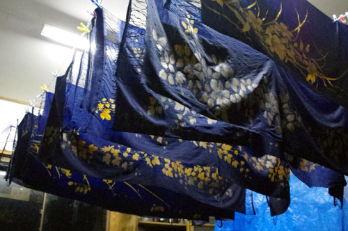 手描きロウケツ絹ショール11枚、麻ノレン90×150cmを1枚染め終わった。・・・しんどい(^^;2月から毎週のように10枚ずつロウの模様を描いて藍を染めてきたが、若いころは追加の仕事をすると段々とスピードが上がって早く描けたのに、今は一枚描くごとに遅くなってきている(--; 息が続かない・・・すぐに休憩(笑手描きの草花をロウで描いて藍染めを行うのは、私の仕事の中でも最も難しい作業のひとつ。仕上がりのレベルを上げたい気持ちが強くなるほど集中力が続かない。実際、ロウの描き方や染めの内容は良くなっている。そして、もっと良くしようという意識は強い。その意識が強くなればなるほど、遅くなる(笑・・・これは、笑うしかない(^^;ガレージが染め場所、3種類のロウケツ模様を乾燥中。藍染めは一日中水仕事。工房の藍染めは絹の場合、1回目の色として、染めと流水による発色を5工程行って乾燥させる。是を3回重ねないと深い藍にならない。今日は染めの3日目。比較的暖かかった。寒さという厳しさがない分良かったのだけど、昨日と一昨日の畑仕事が堪えている。藍の栽培用の畑作業が始まって、身体の節々が痛いのだ!暖かくなって藍の畑仕事と藍染めの両方を一緒に行うのはしんどい!!!たはは(--;これが能登に暮らして自分で栽培した藍を染める実態(^^;▼能登の手の日々 カテゴリー ●全て ●日々 ●街中ギャラリー ●染色 ●能登、そして、この町 ●絵・美術について ●CG ●食べもの ▼能登の手の作品集 (写真・CG) ▼リンク ●ようこそNotoNote オリジナルのデザイン・あつらえの着物。染色・草木染めの専門ページです。 ▼お気に入り ブログ・その他 ●Water-Colour ひろろdecさん ●紅の水絵日記 M-Crimsonさん ●MoMo太郎日記 MoMo太郎009さん ●Kleine Erfrischung kamoppieさん ●考え事ほか vissel-篤胤さん ●地元力向上委員会 hanami73さん ●今日の空 つるまる5さん ●Que sera sera 五右衛門0563さん ●染工房えむ koubou-mさん ●バンブーおじさん奮闘記 幸達さん ●てんてん日記 もえぎさん染色の専門サイト★能登の手へのメール