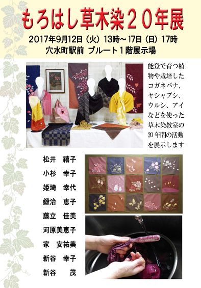 ようやく『もろはし草木染20年展』の案内ができる。DMをプリントして参加者へ(^^ゞ最近仕事が進まない。一度に幾つものことが出来なくなっている。集中力が分散されて・・・同時進行の仕事は、どちらも遅れてしまう(ーー; ・・・という言い訳が多くなった。ということで遅れても、せめて一つ一つの仕事を丁寧に確実に進めていくしかない。で、幾つかの止まっている仕事に関係している皆さん、遅れて申し訳ないです・・・m(__)m『もろはし草木染20年展』DMと『諸橋公民館生花教室展』DM。同時に同じ場所で開催。2017年9月12日(火)13時~17日(日)17時 穴水町駅前 プルート1階どちらも20年前ごろから諸橋公民館で活動を始めた自主教室。もちろん私は草木染めだけの参加だが、小さな地区なので、どちらも行き来している人が多く生花教室にもお手伝いでDMを作成した次第。なんだ、やっぱり幾つも同時進行か(^^;▼能登の手の日々 カテゴリー ●全て ●日々 ●街中ギャラリー ●染色 ●能登、そして、この町 ●絵・美術について ●CG ●食べもの ▼能登の手の作品集 (写真・CG) ▼リンク ●ようこそNotoNote オリジナルのデザイン・あつらえの着物。染色・草木染めの専門ページです。 ▼お気に入り ブログ・その他 ●Water-Colour ひろろdecさん ●紅の水絵日記 M-Crimsonさん ●MoMo太郎日記 MoMo太郎009さん ●Kleine Erfrischung kamoppieさん ●考え事ほか vissel-篤胤さん ●地元力向上委員会 hanami73さん ●今日の空 つるまる5さん ●Que sera sera 五右衛門0563さん ●染工房えむ koubou-mさん ●バンブーおじさん奮闘記 幸達さん ●てんてん日記 もえぎさん染色の専門サイト★能登の手へのメール