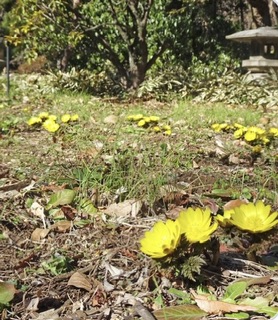 日本庭園 音羽亭の横のフクジュソウが見頃でした。