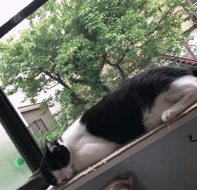 三匹の猫が並んでお隣の庭を見ていた写真と同じ窓です