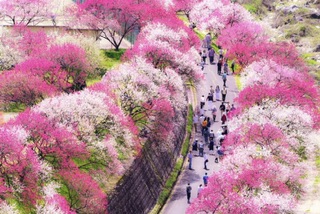 川沿いの道に沿って咲乱れる赤・白・ピンクに咲き分ける3色の花桃が5000本咲く桃源郷の「花桃の里」は阿智村にあります。