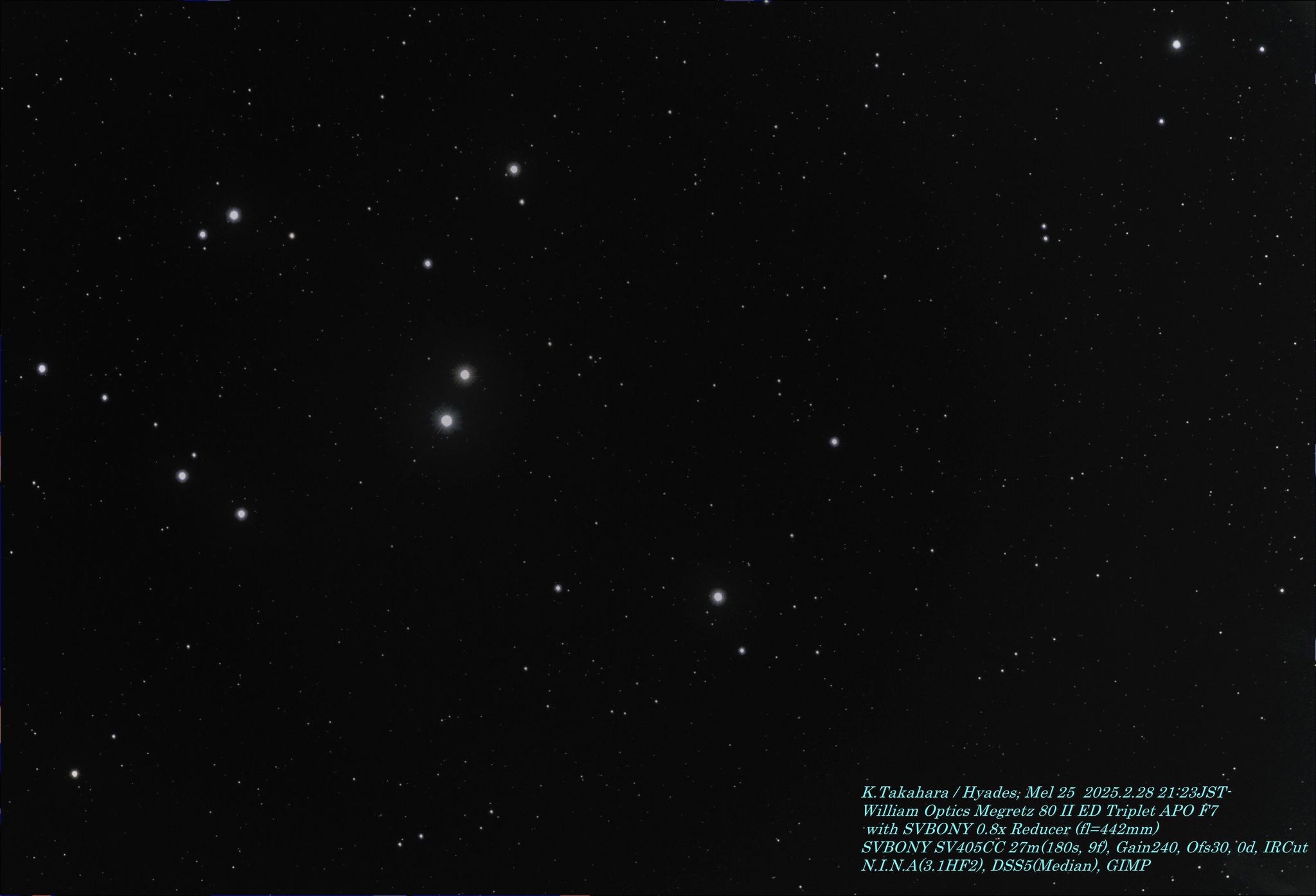 今夜の予報は、SCW,GPVともに、夕方から雲が切れ、夜半過ぎに雲が湧く予報。このところ、天気が思わしくない日が続いていて、欲求不満の状態が続いていたので、短い時間かもしれないけど、夕食後に近所の山に上がりました。今日はプレセペ撮りたいと思っていたので、80EDのセットを使いました。久しぶりだな。まずはヒアデス星団。おうし座にある散開星団ですね。メシエカタログにもNGCカタログにも載っていない不思議な分類の散開星団です。もともと双眼鏡で見るぐらい大きいので、80EDを出したときに撮っておこう、と思って撮りました。写野に入り切れていませんが、まあ記録ということで。眼視だとSWAN40mm、16xで結構見ごたえがあるんですけどねぇ...次はプレセペ(Praesepe)。今夜の本命です。M44、Beehive Cluster(ハチの巣星団)の名の通り、きれいな散開星団です。かに座にあります。こちらも低倍率で楽しめる散開星団だと思います。ホントはここまででC5に載せ替えようと思っていたのですが、雲がところどころにかかってきている状況だったので、時間を惜しんでそのまま80EDで撮影を継続しました。次はM1 かに星雲(Crab Nebula)です。おうし座にあります。さすがに80EDだと小さいのですが...超新星爆発の残骸ということで、カニの甲羅みたいな画像をよく見かけますね。これぐらいの超新星爆発を観てみたいものです。もちろん地球に影響がない範囲でお願いしたいところです...次はM40。メシエ天体としてはめずらしい二重星です。・・・なので、これまた小さい。笑。どうして二重星がメシエカタログに掲載されたのか、諸説ありますが、憶測を含むと思われる部分はここには書かないでおきます。ま、二重星団辺りをM40にした方がよかったかも、とは私も思いますけれどもね。。。すみません、メシエさん。次は観たいものリストに載っていたNGC2326です。・・・と言っても、何も写ってないような気がしますね。。。記録なので、載っけておきます。やまねこ座にある棒渦巻銀河とのことで、実際はこんな形(右上の方)とのことでした。いちおう座標は合っているようです。Astrometryでfits画像にアノテーション付けてみました。NGC天体がいっぱい入ってるみたいなんですけど、一枚撮ってこりゃ写らんと思って、4fで撮影を切り上げたので、さらに写ってないです。次はM84。おとめ座にあるレンズ状銀河です。うーん。。。小さい。マルカリアンチェーンを構成する銀河のひとつなのですが、80EDだとかなりさみしい写りでした。次はおとなりのM86。これもレンズ状銀河ですね。恒星っぽくしか見えないなぁ。。。最後は少し左へ振って(東でいいんだっけ?180°回ってるらしいからよくわからない)、マルカリアンチェーンっぽい構図にしてみましたが、よくわからないですね(^^; これでも30分撮ってるんだけどなぁ。右上にM87が入ってきました。Astrometryのアノテーション画像はこちら。いっぱいあるはず。笑。実はこれを撮ってるときに、ガイドがポーンポーンと言いだしたので、空を見上げると、星がない!なくなってました。午前0時を回っても予報に反して晴れていたので、気を抜いていたら、いつのまにか辺り一面、濃い霧に包まれていて、視界は5mぐらいになりました。おかげで、ビショビショになった機材を一つずつ拭きあげて仕舞うことになりました。。。撤収に小一時間ぐらいかかりました。レンズ面は乾いたらまたアルコールで拭きあげることになりそうです。ちなみに自作のヒーターは役に立った気がします。C5用に作ったのでちょっと長さが余ったけど、止め方を一工夫しないといけないみたいです。ヒーター、電池それなりに食うしなぁ。ON/OFFを繰り返すから、バッテリーの液晶表示がしょっちゅう点いたり消えたりするのが結構めんどくさい。あとは、ガイド鏡が曇るのは考えてなかったなぁ。。。どうしようかな。ま、ガイド鏡の方は適当な径の塩ビパイプでも見つかったらいいなぁ、と考えております。久しぶりの出撃はこんな感じでした。とりあえず、ストレス発散できました。