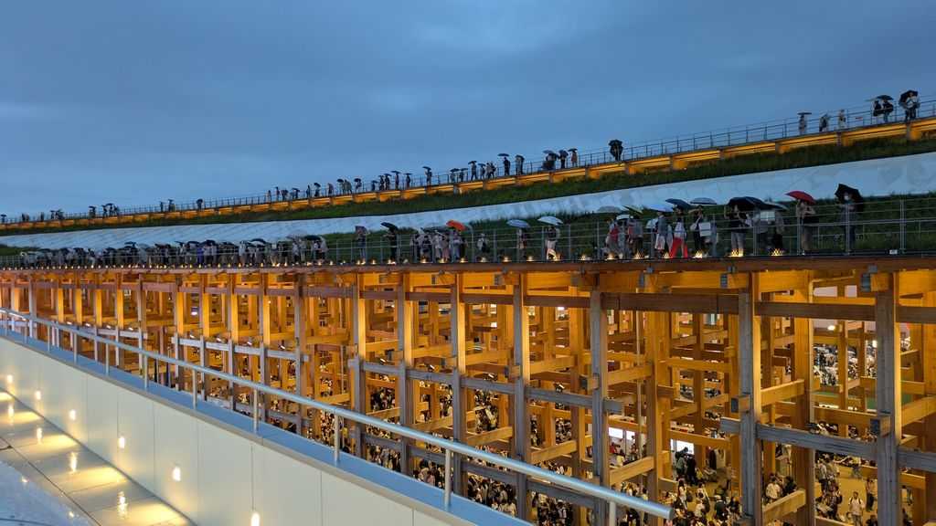 (戻る)日本館のラストはこんな感じ。とても緻密なフレームが組み合わされていて、すごくキレイでした。夕方から入って、まだ半日しか経っていませんが、すでにヘロヘロ。笑。夜の大屋根リングに上がって、歩いてみることにしました。ネオンに彩られた風景にカタカナが見えると、なんとなくブレードランナーの世界っぽいですよね。笑。観られなかったところは明日チャレンジすることにして、少し早めに万博会場を後にしました。人はすごく多かったですけど、予想に反して電車のホームまでノンストップ。ちょうどホームに止まっている電車に乗れました。こんなもんかなぁ?と思っていたら、横の若者が「いや、平日の夜でもこんなもんじゃなかった。今の進み具合は奇跡だよ」と連れの方に話していたので、今夜のスムーズさは特別だったみたいです。よかった(^^)(続く)