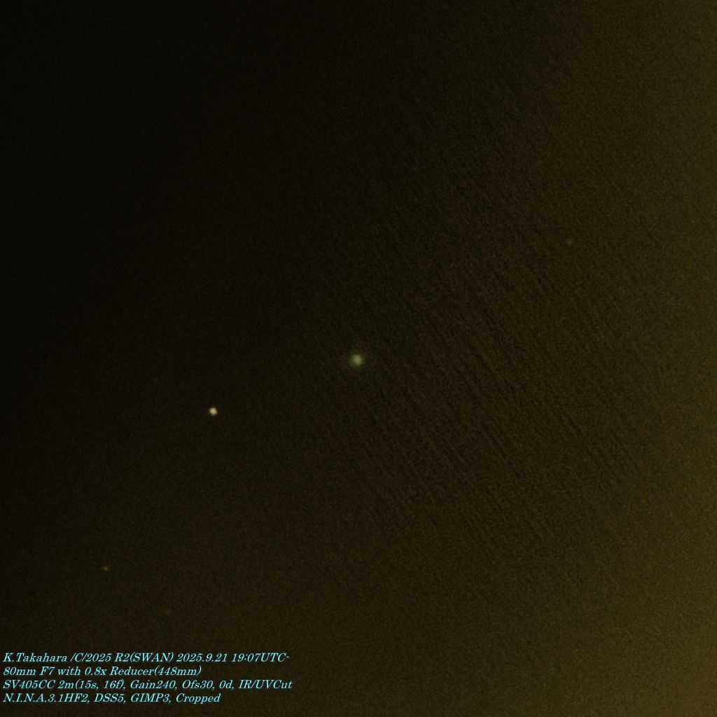 天候に恵まれず(最近、こればっかし)、悶々としておりましたが、なんだか南の方は夕方晴れ間が来そうです。んじゃ、行ってみるしかないねぇ。というわけで野母崎までひとっ走り。途中、一件、お使いをこなした後、初めての海岸へ行ってみました。なかなかいいロケーションだけど、ちょっと西側に出ている岬が被るかもね。駐車場の一番奥の端っこに機材を出してみます。今日は宵の高度が低い彗星だから極軸は合わせてるヒマがないなぁ。というわけで、GPSでだいたいの北を出して、そっちに向けて設置。ステラリウムでアークトゥルスを導入。どれどれ?おー!ファインダーに入ってるじゃないですか!さすがおれ!(いや、たまたまっス)カメラの一次冷却をしながら主鏡で撮像してみると、背景が明るくて画面がぶっとんでる。笑。0.005sぐらいでなんとか恒星が見えるようになった。センタリングして同期。んー、同期したんかなぁ?どうもあやしい。ま、ヨシ。次は火星。これも写野に入ってきた。見つけるのはかなり難しいけど。センタリングして同期。どうも導入のときにステラリウムのターゲットがヒューーーンと移動してこないのが、すごく気がかり。いつからだろ?ワープしてる感じがあるわ。ま、いっか。本日のターゲットである、SWAN25B、改め、C/2025 R2(SWAN)を導入。いやあ、背景が明るいわ。雲もあるしねぇ。。。とりあえず0.5sで撮像開始。ようやく15sぐらいになったところで、かなり低空の雲がジャマになってきたけど、まあ撮れました。あわよくば、K1 ATLASとのランデブーを撮ろうか、とも思ってたけど、こりゃ無理だわ。撮影中に辺りを見回すと、後ろに明るい街灯が。。。まあ、西を撮る分にはいいけど、ちょっと明るいなぁ。少し手前にあった道路わきの方がよかったかしらん。まあ、今日は移動できないけど。帰りにロケハンしていこうっと。というわけで、C/2025R2(SWAN)です。・・・いや、さみしい写りですねぇ。。。まあ、来月が本番ですから。さて、せっかく晴れているから、これまで天候に恵まれなかった3I-ATLASを撮ってみます。だいぶ暗くなってるみたいだけど。おっと、その前に、せっかく空が暗くなったんだから、極軸をTPPAで出して、ガイダーのキャリブレーションをば。。。3I-ATLAS。こんな感じでした。帰宅して、X見てたら、Michael Jagerさんが「Lemmonが10月に化けるかも」とポストしていた。んー、んじゃ、夕飯食べたら、もう一回ヤマにでも行くか、と思いながら、夕飯の皿うどんをパクパク。おいしいねぇ!さて、食後の一服じゃ。外に出てみると、一面の曇天。あー、こりゃ今夜はダメだなぁ。また次回ということで。。。