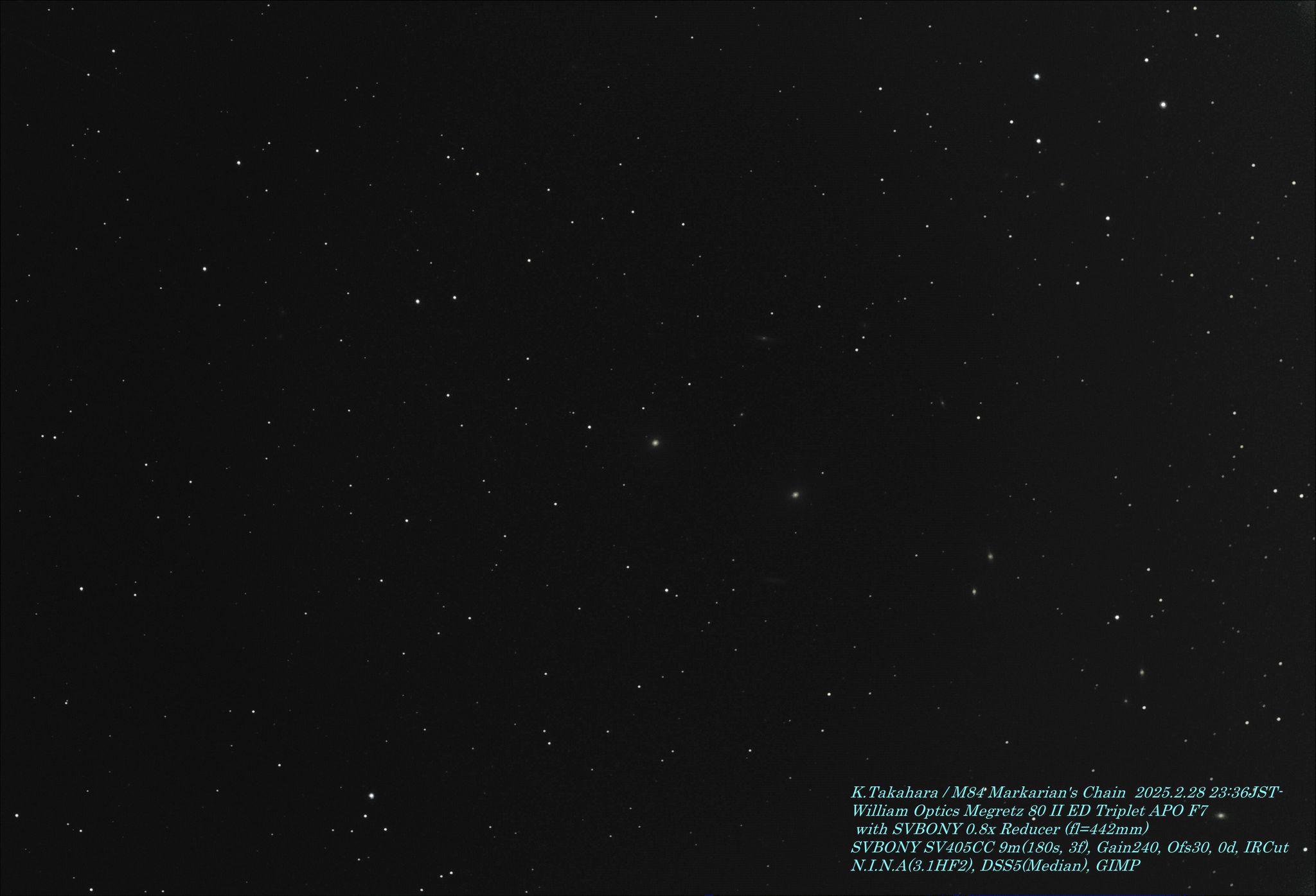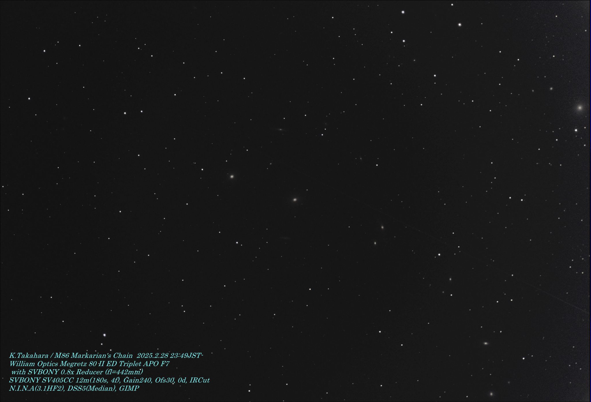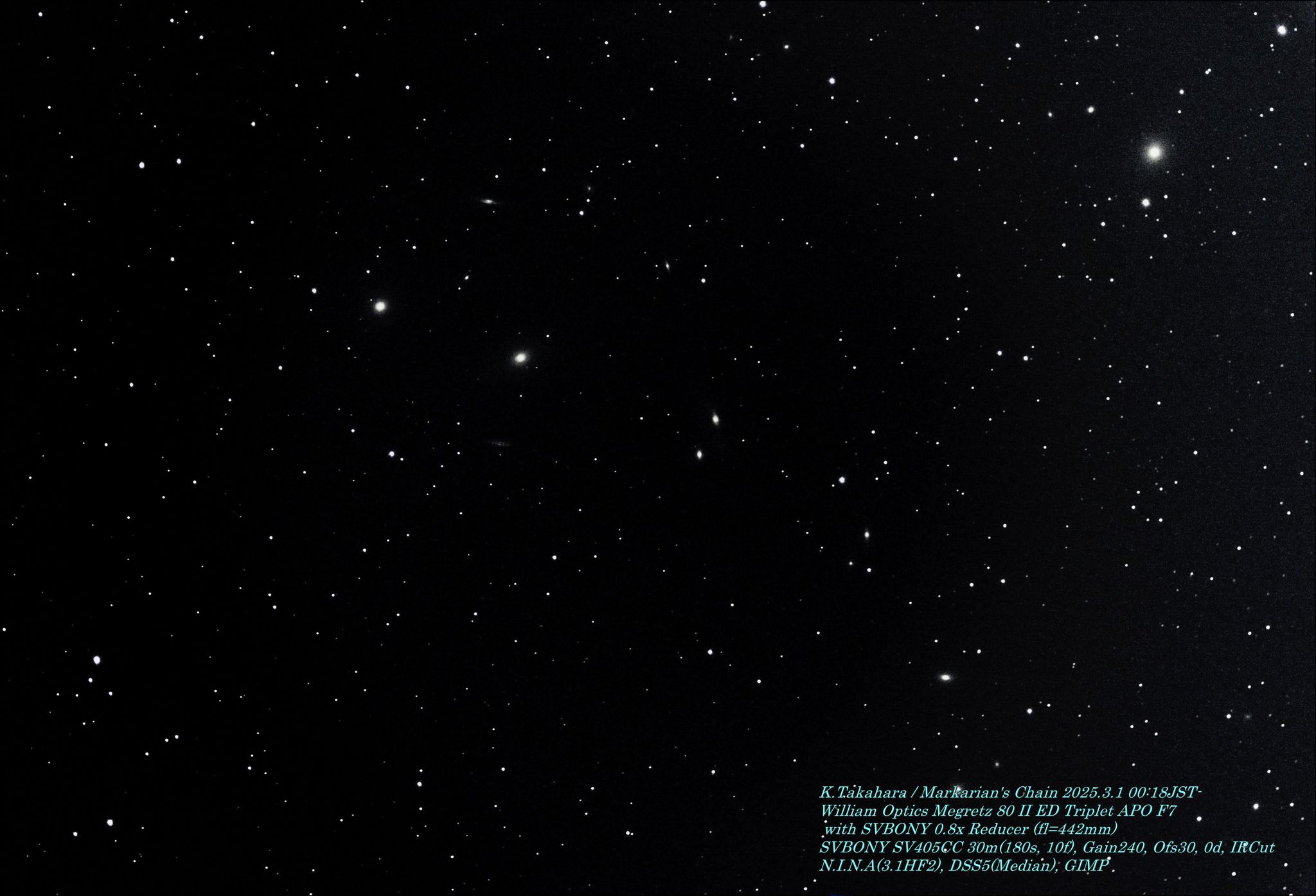 最後は少し左へ振って(東でいいんだっけ?180°回ってるらしいからよくわからない)、マルカリアンチェーンっぽい構図にしてみましたが、よくわからないですね(^^; これでも30分撮ってるんだけどなぁ。右上にM87が入ってきました。