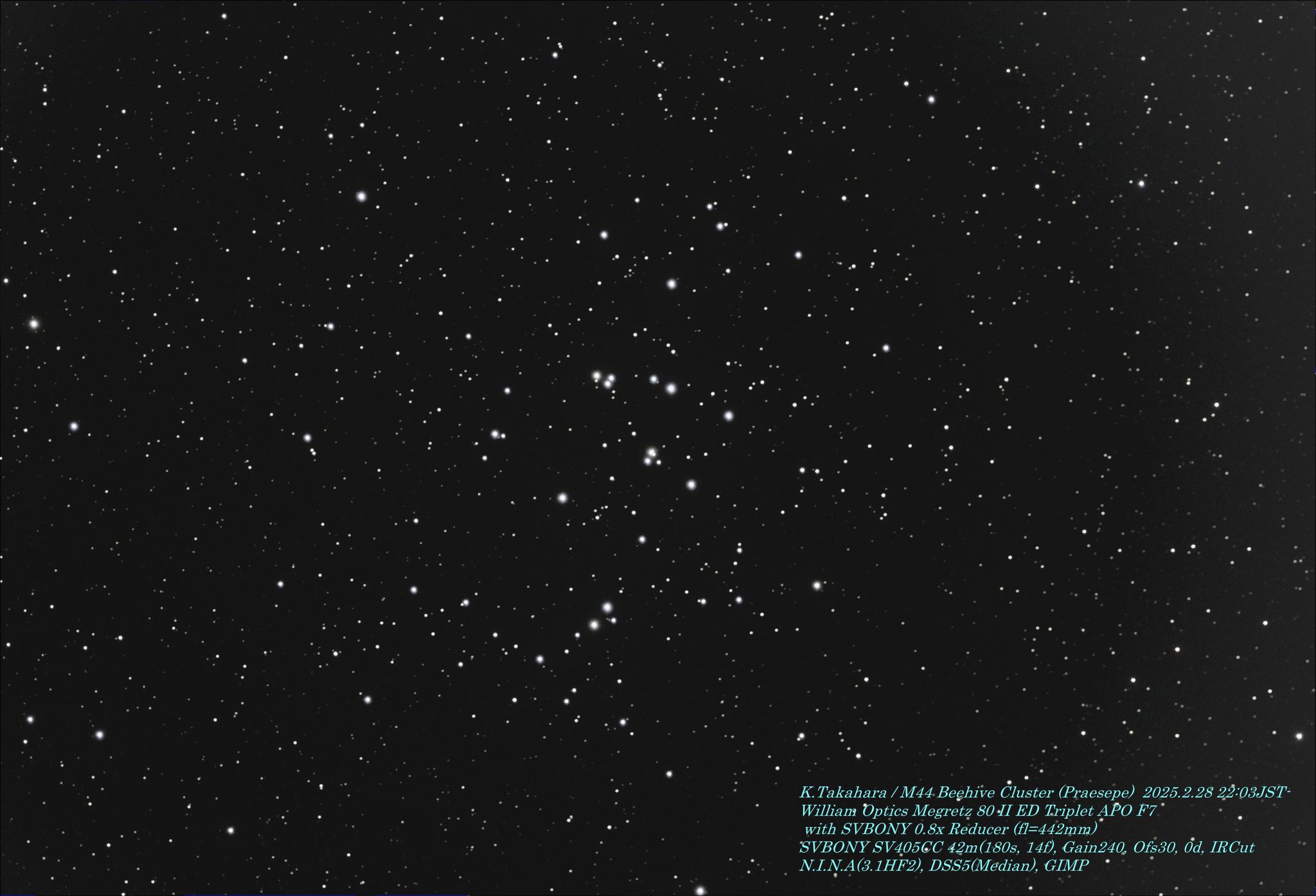 M44、Beehive Cluster(ハチの巣星団)の名の通り、きれいな散開星団です。かに座にあります。