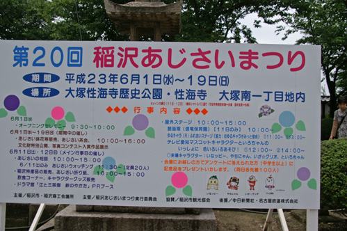 おはよう御座います名古屋曇っておりましたが 今は太陽の光が燦々と輝いております梅雨の晴れ間になるのでしょうか 予報では毎日雨ですがアジサイで当地では有名な性海寺を紹介します看板稲沢市では、歴史公園として平成4年にオープンし毎年6月1日頃から 『あじさい祭り』を開催しています山門江戸時代に作られ 現在稲沢市の指定文化財主柱間寸尺 11.7尺の薬医門明王殿この寺院は弘仁年間(810年~924年)空海によって愛染明王を本尊として創建されたと伝えられています本尊として祀られていますキャラクターお祭り期間 賑やかない 演舞していました三宮社江戸時代は寺院と神社 同じ境内に祀られて居ることが 多かったのですが 明治時代の廃仏毀釈で 分離がなされたのですが 同居していました宝塔室町時代の建立と言われています重要文化財となっております