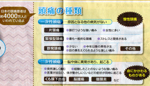 おはようございます今日の名古屋 今は曇っていますが 間もなく晴れてくる予報です 32度の見込みです新聞休館日は 手持無沙汰ですね昨日は炎天下 午前中3時間ウォークコースの下見午後 2時間 梵天祭りの同行 参りました今日は昨日地元紙 中日新聞で 「片頭痛」について特集がありましたので アップ致します頭痛の種類4000万人の患者総数とは ビックリですね一次性頭痛は 痛みは凄いですが 原因がわかりにくい二次性頭痛は 怖いですね 生命に直ぐかかわり 後遺症も出てきますから頭痛を持つ人の割合片頭痛は 6% 疑いは 2.4% 15歳以上で国内で840万人 と多いですね 高年になってからの発症は 殆ど無いようです日常生活に支障26%の方は影響ないのですか 他はなにがしか影響を受けています女性に多いどの年代でも 男性よりも 多いですね男性は60代以降は 発症自体無い状態です月経との関係が あるようですね子供さんも片頭痛餅の子供さんは36%が医療機関で処方を受けています 更に8割近くが家族で片頭痛を持っていますから 遺伝的な面も疑われますね受診経験受診してる方少ないですね 頓服 セデス等を飲んで処理されているのでしょうか症状の特徴この様な特性が 色々とあるのですねトンカツは 持っていませんが 友人では聴いております