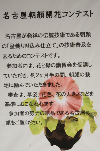 おはようございます今日の名古屋は 晴れ渡り 34度予報です猛暑日が続いています昨日は 短大の講座で 練り食品についてでした午後から キャノン・ギャラリー フジギャラリー2か所 見て回りました今日は昨日の続きで 名古屋朝顔展 最終をアップいたします開花コンテストこの展示会の為に 種を何日前 最初の水は 日に 何CC と決められていますコンテストについて 書いてありました審査基準公平性と 継続性を狙いに 審査基準が講評されていましたこれに従って 審査され 優秀な作品が展示されていました競技花審査で評価されました 作品が一堂に展示されていました不二の誉人位 味鋺園 橘氏 紅玉の光地位 小須賀園 早川氏一真地位 浜松園 兼子氏五茶人位 天尊園 土井氏天城の風天位 浜松園 兼子氏他展示されていましたが 園がついておりプロの鉢植えで さすがですね