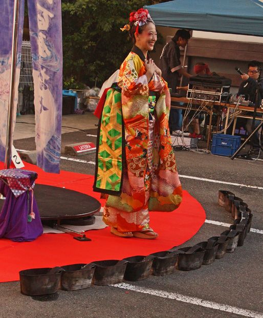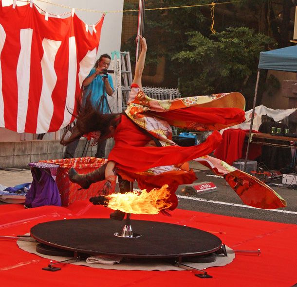 おはようございます今日の名古屋は 晴れていますが 曇ってくる予報です24度~14度予報です 最高温度は巡るましく動いています昨日は午前中講座 午後からは墨絵 書道 絵画等 鑑賞して回りました今日は大須大道芸祭り お七を2回に渡りましてアップします登場 会場は前に脂をしみこませた 布 一本の 鉄柱がありました ニコヤカな表情です何か 物思いにしてる表情 羽子板を持っていました突然に 恋人を思い出したのか 発狂的な表情で 鉄柱を グルグルと回り始めました大胆な 振り乱して着物を 表情もブーツを この様な姿で ブーツを履きかけました突然 この様に油をしみ込ませた 器具に点火して 呑み込むような表情をしていました呑み込んで 火勢の強いのに 完全に 口の中に入れて 消えました 恋人に会いたいための行いかな多数の この様に多数の火球を 作りだしました明日続きをアップ致します