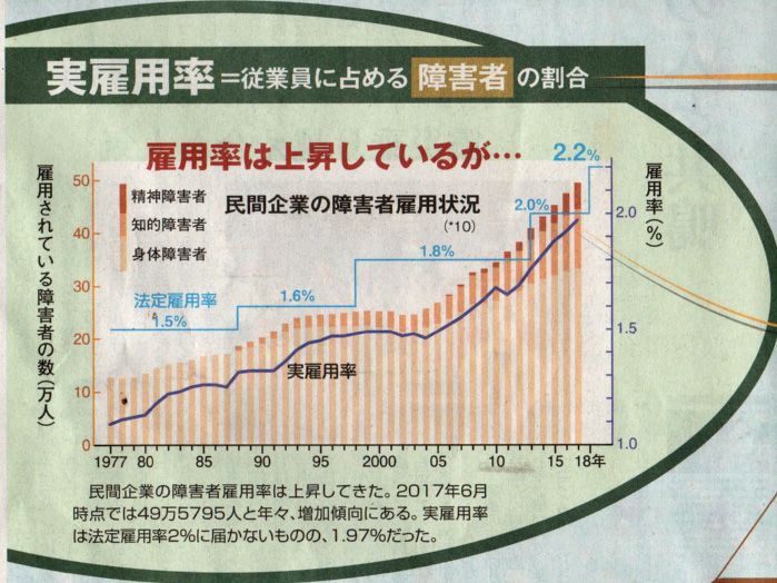 おはようございます今日の名古屋降り出しました 12号の上陸も 言われだし被害が出ないように 祈るのみです昨日は能楽堂で ギター演奏 その後円頓寺七夕祭りに 行きました今日は先日地元紙 中日新聞に掲載されていました障害者雇用の特集 アップ致します雇用率 実雇用率は法定雇用率2%に 近い1.97% となっています変更 今まで障害者雇用に 4月から 知的障害 精神障害 も含まれるようになり 2.2%となりました手帳所持が対象 これからの雇用率のカウントは 手帳を 持った人です 持っていない人は雇用から はじかれるかも 知れません賃金 身体障碍者は 25.4万円に比して 知的障害者 精神障碍者は半分以下 となっています これから改善が求められるかも規模別雇用率 中小企業では 1.6% 法定雇用率達成は 46.5%です 大企業では 2.16% 法定雇用率達成は 62.0%です定着率 1年以内に4割が離職しています 高過ぎますね納付金対象 従業員100人以上の企業が対象となります
