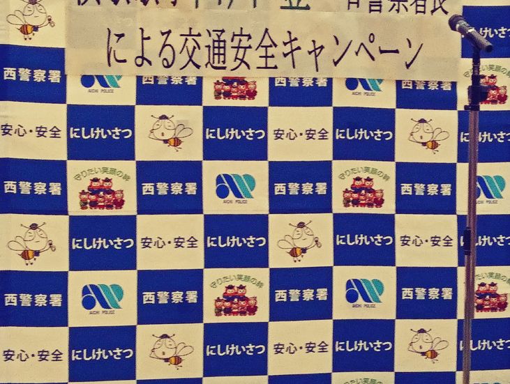 おはようございます今日の名古屋晴れています 29度見込みです昨日は高浜氏春日神社秋祭り おまんとを見学に行きました先日名古屋西警察署の一日署長に山川豊氏が任命されました アップいたしますバック このようなバック よく見かけますね スポーツ界 政治界 唯に警察署までに 及びましたね場所 イオンモゾタウン イオンの店舗としては超大型店です 1回で広場で開催 2階 3階でも このように 見下ろしていました挨拶 正規の警察署長 西区長の挨拶終了後 山川豊氏は 登壇 訓示を含めて 交通事故に対しての 話でした 参考に ここ11年間 交通事故死数 愛知県が ダントツの多さです 今年はワースト記録返上を全県運動に 皮肉ですが 昨年に4名増加 ワーストの記録 保持したままです終わって 訓示が終わり 行事は終わりました 敬礼でした参加者に 今日のお土産に 手に占める 反射板です 山川氏が 一人づつ 手渡し 握手 サービスが ありました終わって 西署員の方々 緊張感が取れて ホットした 表情 上下関係の 厳しい職場を 瞬時見た感じでした