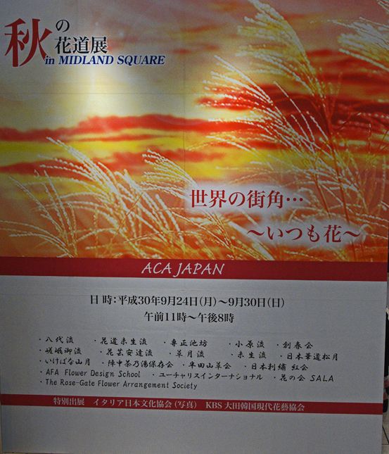 おはようございます今日の名古屋 曇っていますが 晴れてくる見込みです昨日は朝早く公園清掃 その後シルバー仲間と ランチ会途中から 名古屋港での花火大会 撮影場所確保で 約5時間座っていました 素晴らしい 花火大会でした先日名古屋駅前の ミッチェランドビル 地下1階で開催されていました 秋の花道展をアップいたしますポスター 地元紙で報道され 興味がありましたから 訪れました美女が 会場オープンが11時からでした 15分位経過して エスカレーターから 下って見えました チョゴリが豪華で かなり韓国では 上流の方かなと 思いました 出品されている方々いけばな山月 川島氏 加藤氏 花瓶が水色 秋の花で綺麗でした八代流 佐治氏 バラの投げ入れを前面に ユリを多数 使用されていましたフラワーデザインスクール 舟橋氏 秋らしい色合いの花 花瓶でしたユーチャリスタインーナショナル 竹内氏 真っ赤な花を 主体に 構成されていました草月流 5人の競作和服 淑女が ゆっくりと 鑑賞して見えました太田韓国現代花芸協会 花瓶が大胆ですね太田韓国現代花芸協会 花は少なく 玉をうまく 使った作品でした太田韓国現代花芸協会 さっぱりした 感じを 受けました花の会 SALA 3人共同 とてもシンプルな 作品でした太田韓国現代花芸協会 柵の中の 庭を連想しました 花道展ですね
