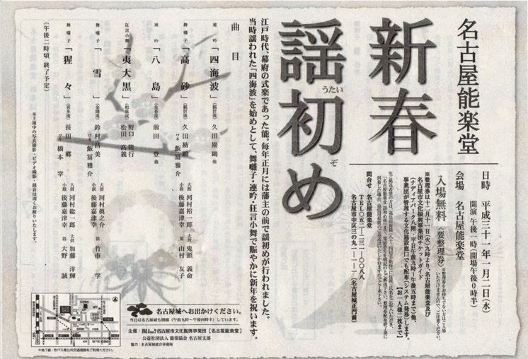 おはようございます今日の名古屋晴れています 最高温度8度見込です昨日は午前 老人会新年の集いでパン配布 その後白鳥庭園でカモメ撮り練習 でもカモメは一匹もいなかったですその後 懐かしい映画鑑賞 中日写協入選写真展示を 鑑賞に行きました今月の2日に発外出して 能楽堂での初謡 その付近の神社を参拝しました アップいたしますパンフ 毎年各流派の 謡が開催されて 今年も 鑑賞しました能楽老内部 約800名収容で95%は 詰まっていました 演奏中は 撮影禁止 本日アップの画像は 全て スマホです愛知県護国神社鳥居 以前はこの鳥居の前に 日本一を意識した 大門松がありましたが 本殿前に代わりました 本殿 太平洋戦没者が中心ですが 徳川時代からの 英霊が 祀られています那古野神社鳥居 名前は なごやじんじゃ と呼びます 名古屋の由来 の一つかも 名古屋城築城(1610年) 場内で 祀られました本殿 延喜11年(911年)創基と伝わっています 津島牛頭天王社を総社としています 今日と八坂神社と 同系福神社 名古屋東照宮の摂社 名古屋開府の祖神にし恩神 として 祀られています名古屋東照宮鳥居山門 この神社も 名古屋大空襲で 焼失しました本殿(愛知県指定文化財) 家康公逝去後三年 元和五年(1619)九月十七日 藩祖義直公によって 建立 名古屋城内で 明治9年名古屋城から 鎮座 昭和20年名古屋大空襲で焼失 昭和二十八年十月尾張徳川家より藩祖義直公の正室高原院殿 (春姫)の霊廟〔慶安四年(1651)建立〕を移築しました