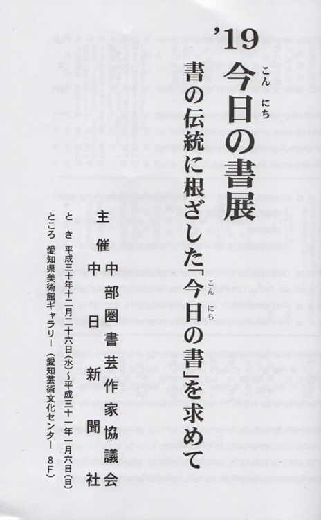 おはようございます今日の名古屋曇っていますが 小雨予報です最高温度は 10度の見込みです昨日は午前 ジム 午後から能楽堂で仕舞を鑑賞その後鶴舞公園での 写真展鑑賞しました年始早々 愛知県美術館ギャラリーで開催されていました書展を鑑賞してきました 2回に分けましてアップいたしますパンフ 会場の入り口で 貰いました 出展者の名簿と 題名が記されていました幽 小坂青湖氏門の中 野田浮舟 とてもユニークな発想でした 笑いの部分が浮き上がって いました ほほえましさを 感じましたトンパ文字「登る」 福永照久氏 人が元気よく歩いて 登ってるように 見えました瀧 颯田圭子氏 滝の水しぶきを感じました淡然流世栄 平松志峰氏 白墨 黒墨 の使った作品宇 鈴置寛氏 お面を想像してしまいました風 小久保大虚氏 92歳高齢な先生の作品と 見えない 若々しさ あふれる作品と 思いましたMOVE’19 横田節子氏 絵画に近いですねあゆみ 飯見真由氏 バッタの足の部分が跳躍してるように 見てしまいました天へ 青山和子氏 泡が上昇してるように 見てしまいました寂 石原秩津子氏 縫いクルミのクマちゃんを連想してしまいました