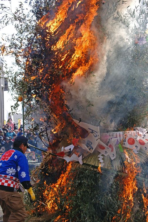 おはようございます今日の名古屋は晴れ一色 最高温度16度見込です昨日は午前退会される方の 記念品届け 午後からは趣味の会の定例会 知人の展覧会 その後 ピアノ演奏会でした今日も昨日に続きまして 岐阜県海津市 今尾の左義長を 燃えだして 倒壊までを アップいたします燃えだして 藁で点火されました 火勢 瞬く今に 炎が このようになりました火勢最高に 2~3分で このような火勢 になってきました まだ 立っています縄が このように長い縄が 出てきました 水が しみ込んでいます 若者が元気よく 走って まくのです走って 縄の先端を持って 燃えている 神輿を グルグル巻きに するのです倒れかけ このように倒れる方向を 一定にしてるのです 縄でグルグル巻きにして 引っ張るのです横に傾いて 火勢も 弱ってきました 倒れる少し前です横になっても まだ 可なりの火の余勢はあります一斉に 火が燃え突きますと 十字の青竹で 燃え残しを 残骸を 移動させるのです必死 煙と火との 戦いです 煙い 熱い このように転ぶ人もいました愛嬌 ユニークな方ですね倒れて アルコール 疲れ も出てきての 神経使う 灰の片づけ