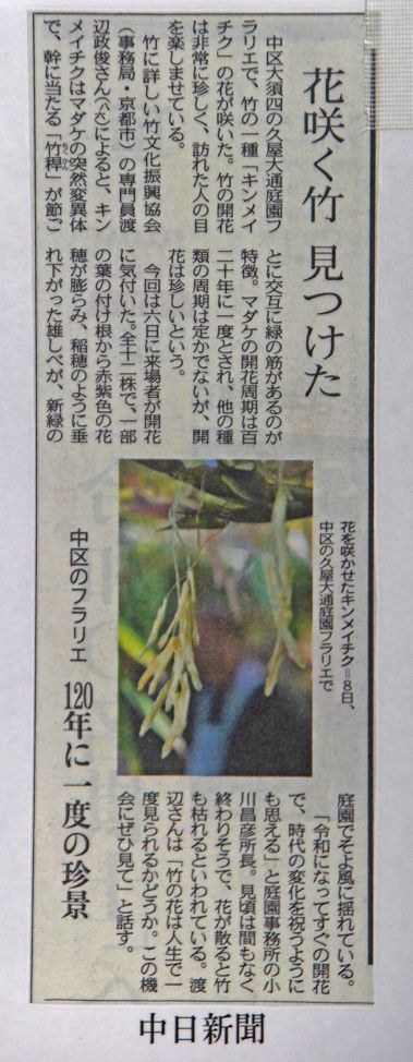 おはようございます今日はとても珍しい 竹の花が 咲きましたのでアップいたします新聞 地元紙中日新聞で 報じだれました 名古屋の中心部 フラリエで 竹の花が 咲いたと 早速出かけました案内 公園に着きまして 職員さんに聞かなくても 案内が 施されていましたイネ科 キンメンチク この公園に何時 食された 判りませんが もうすぐ 枯れてしまう 竹です竹藪?? この竹に 花が咲いたのです 新聞では 120年位先 枯れてしまうのです 人も この花を見る機会が 非常に少ないのですアップで 竹の葉の先に このように 咲いていました 恐らく皆様も この先 直接見る機会は 少ないと思います