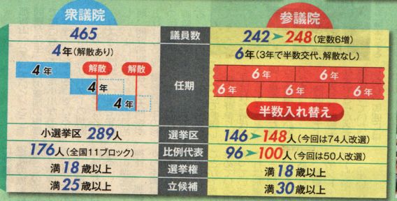 おはようございます今日の名古屋は曇りの予報です昨日は愛知県セミナーに参加 3時間連続講座を聴講しました地元紙 中日新聞の特集で 参議院選挙制度を 纏めていましたので アップいたします衆議院 参議院の選挙内容です被選挙権が違いますね政党化 発足当時は 常識の府を行くような内容 今では 衆議院の コピー化 ですね不平等な一票 違憲状態の判決も出ました 事務方では苦心して 手直しを 何度も行っています 今回の選挙では 2県を纏めて 1人選出も 2カ所 でました選挙区 全国の都道府県で 表示されていました 徳島・高知で一人 島根・鳥取で 一人 英断ですね比例代表 ドント式で説明がありました特定枠 2カ所で合区がありまして おらが代表が県から 選出されない 場合もありますから 特定枠が 作られました年代別投票率 若い世代が 低いですね投票の選択 若い層と 高齢者層とは 違いますね