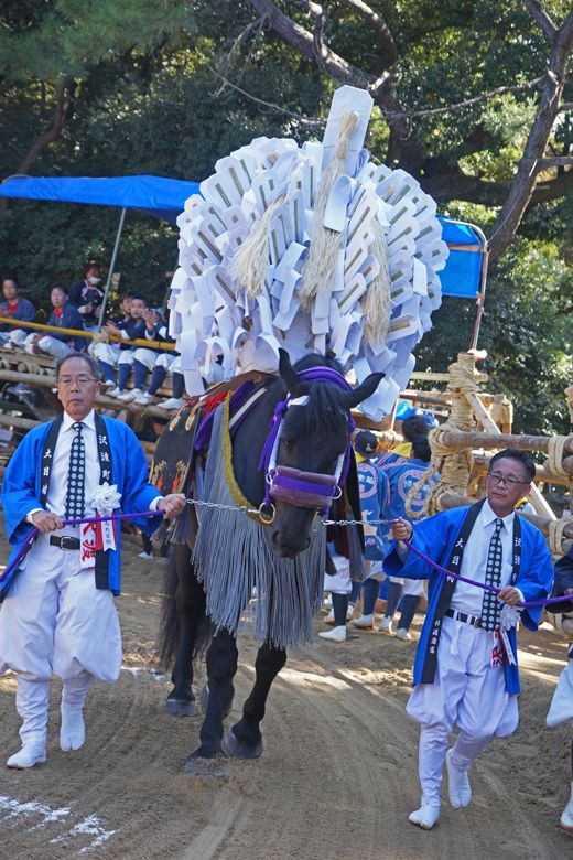 おはようございます今日の名古屋は晴れています 最高温度は24度見込です昨日は銀の鈴合唱団の演奏会を鑑賞しましたプロの女性歌手 15名の合唱は圧巻きでした先日開催されました 高浜市 春日神社 おまんと祭り朝8時半に 現地について 写真を撮りましたアップいたします御神馬 当番町内が 主体で祭り 御神馬の提供 これから 祭りが 始まります子供も このようにポニーを主体に 子馬を 曳いて 子供たちが 15m置き位に並び 順番に 歩いていくのですスクラム 運動関係と同じように 円陣を組んで 大きな発声 これから始まる危険大の 祭りの気合入れです 七町内が順次行います 大きな町内は大勢 小さな町内は20名以下でした荒馬 馬が馬場に入る前に興奮状態に 時速40km 近い 全速力で 疾走します落ちる 疾走する馬に 横乗りするように 若者が 飛び乗り するのです 振り落とされるのです その瞬間です 下は厚い砂が 撒かれています怖い 飛びかかろうとして 馬の迫力に 恐怖感を 感じて 逃げる 若者です恐怖 この目つき 怖かったのでしょうね 町内の係の方が 落ち着いての声 でしょうか格好よく 後ろの若者は 振り切られ 次の若者が 勇壮に 飛びついた瞬間ですやられた 馬に振り落とされて ドーンと この時 馬の蹄の犠牲になりますと 大怪我ですやはり このように 落ちるのは 殆どでした馬の目 飛びつけるかなと 疑いの 馬の目 挑戦する 若者です鈴なり 一周120m の馬場です 安全柵がこしらえてあり そこにこのように 一杯です 運びだし 救急車が常駐し 医療テントに 運び込まれます 時折 サイレンが なっていました大成功 疾走する馬に このような形で ぶら下がりますやるぞ 大型の馬に 挑戦する 若者馬の目 捕まえれるかな と馬の目が 語ってるようでした危ない 危険な祭りですが これが前日から 朝の9時から 17時まで 7町内が 順番に 繰り返すのです疾走する馬の 蹴り上げる 砂 頭から 体の中まで見学者に 襲ってきます馬とカメラが接触しましたら 壊れて終わりです高浜市内の神社でこの時期 開催されますが高浜の総氏子になっており 一番勇壮と聴きました