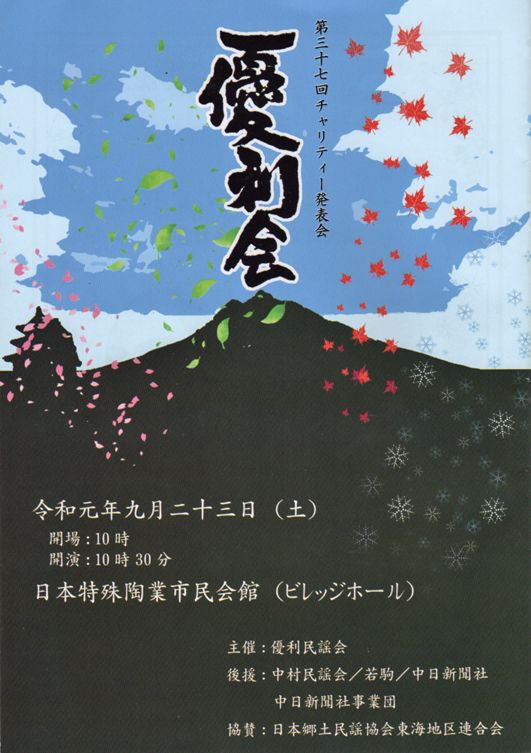 おはようございます今日の名古屋は曇り予報で 29度の予報です昨日は趣味の会で 西区役所ロビーでの展示会開始午前飾りつけ 午後からはやはり趣味の会の世話人会でした9月23日鑑賞しました 優利会 第37回チャリティー発表会を アップいたしますパンフレット 1冊200円 でした看板 舞台の上部に 飾ってありました開幕 三味線大合奏 秋田節 秋田おばこ バチの捌きも 歯切れがよく 迫力ありました踊り 時折 歌われる方の 前で 踊りもありました 民謡ですから 日本舞踊とは異なり 動きが 早かったです子供 未来の宝物コーナーとして 5人が出場 小学1年生から6年生まで でした 一人年長組も 歌は チャグチャグ馬子二人で お嬢さんは年長組でしたが シッカリした リズムでした合唱 刈谷支部 8人の支部の方々 津軽甚句 揃いで 和傘を持っての 踊り とてもキビキビして 気持ち良い 踊りでした太鼓踊り 歌は秋田甚句 歌は 中村ひろ沙都名取合奏 津軽あいや節 歌いは 7人でした踊り 南部よしゃれ節 踊りは 浅野美和子さん津軽三味線 バトル 凄い迫力でした 白い着物は 高校生です 家元 一家 ファミリーコーナー 会主の中村家の 面々です 皆さん 流石 家元の 家族ですね 素晴しかったです 一人づつ 津軽民謡メドレーでしたフイナーレ 10時半にスタートしまして 17時近くまで 途中で 10分間の 休憩のみ 全 68曲でした