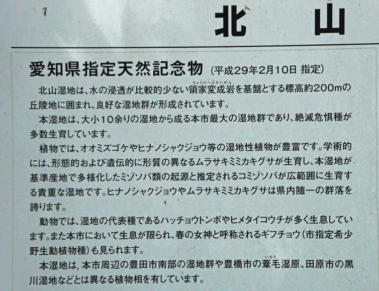 おはようございます今日の名古屋晴れ渡り 31度見込みです先週訪れました 岡崎市 北山湿地をアップいたします説明文 岡崎市内では最大の湿地 絶滅危惧種が 多数 生育してるようです案内図 ギフチョウの採取禁止の 看板を途中で 何回も見ました 注意看板 湿地で小動物も多いですから マムシは いますね でも実際に看板を見ますと 躊躇してしまいますオキナゴサ 山苔 です小径 このような 道が 続いていました見下ろして 谷に降りる道は 在りませんでしたが このように シダ類が 多かったですアザミ よく堤防で見かけましたが 最近減少してるように 思っていましたやなが沢池 風が弱く 波も少なく 反射写り込みを 撮ってみました静寂 吸い込まれそうで 人はトンカツのみでした