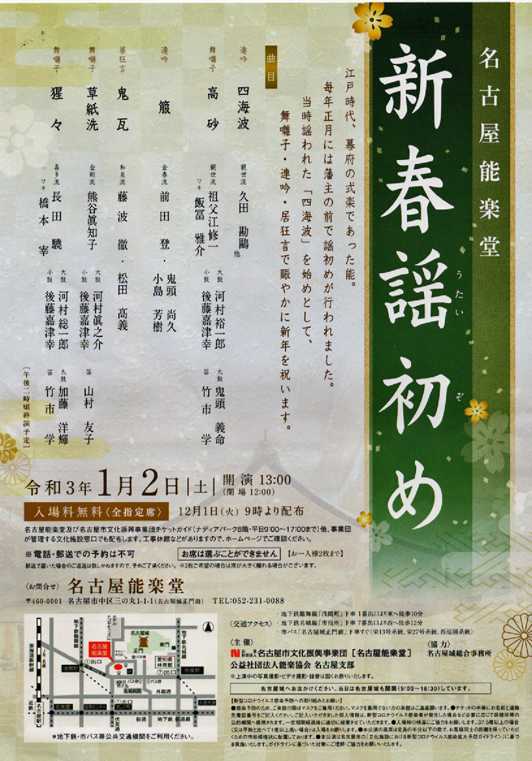 おはようございます今日の名古屋は晴れ 最高温度10度見込みです毎年恒例の 能楽堂で開催されています 新春謡初め鑑賞後 護国神社・東照宮・那古野神社・初詣2回に分けまして アップいたしますプログラム 収容人員の 50%近くに抑えた席割でした 演目は 正月用でした清正像 尾張出身の戦国武将 槍で有名 熊本城主に なりました この像は 名古屋城内にもあります能楽堂 落ち着いた作りです正面玄関 今年は全席指定席で 配布されていましたから 並ばずに スムーズでした舞台 最近は能関係以外にも コンサート 対談 他に 活用されています 壇上は足袋着用が義務化しています 約 1時間20分3列目 正面で鑑賞出来ました護国神社 鳥居です 15時近くでしたが 参拝客は 少なかったです境内案内図 数字案内は 記念碑の場所です手水舎 コロナ対策で 杓は置いてありませんでした拝殿 ユックリ 参拝出来ました