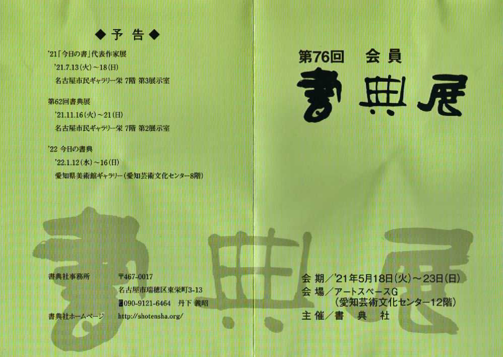 おはようございます今日の名古屋は曇り 午後から晴れてくる見込みです最高温度は26度見込みですコロナ下で 各種展示会が 中止されている現状愛知県立芸術文化センターで 開催れました 展示をアップいたします会場で配布されていました 出展者名簿です題名 作品(作品文字ではありません) 石原秩津子 氏午前中に家内が 午後から トンカツ 別々鑑賞でした題名 あゆみ 1 飯見真由 氏今回の展示は 公募 生徒展示を廃止 先生方ばかりの 出展でした題名 あゆみ 2 飯見真由 氏題名 にんげん60 鷲尾秋香 氏題名 宇 鈴置寛治 氏題名 月影 永谷久美 氏題名 光明 近藤久芳 氏題名 功徳 丹下義昭 氏題名 いろは歌 小野むつ子 氏題名 糸 額田ひさえ 氏題名 生命 1 青山和子 氏題名 生命2 青山和子 氏題名 禍災を生きる 平松志峰 氏