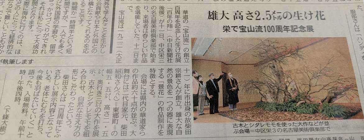 おはようございます毎日桜便りが 新聞で報道される時期に入りました トンカツは桜も大好き人間気合は入りますが 思うようには動かれずが現状です 先日地元紙 中日新聞で 宝山流の記事を目にしました 観賞してきました アップいたします新聞記事です 12日最終日に 観賞しました名古屋美術倶楽部はビル玄関で 履物を下駄箱へ珍しい 構造です鑑札は 和渓庵 鑑札 恵雲庵会場光景 このように畳の部屋でした 華展でも珍しい光景鑑札 浩月庵鑑札 良月庵鑑札 和幸庵鑑札 和恵庵鑑札 香導庵展示展示鑑札 浄清庵家元 流派は大正11年(1922年)創立されて 丁度100年 名古屋近隣での 派活動です 作品は 幅 5.5m 高さ 2.5m 奥行 2.5m偶然家元と話をしました この作品をラインで 仲間に送信見せましたら 大変喜ばれました 88歳で 戦争中 疎開の話しトンカツの家にも 疎開生徒 50名近く 寝泊りしていました