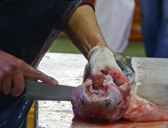 鋭い包丁で 口も割られ 何か恨めしい目で