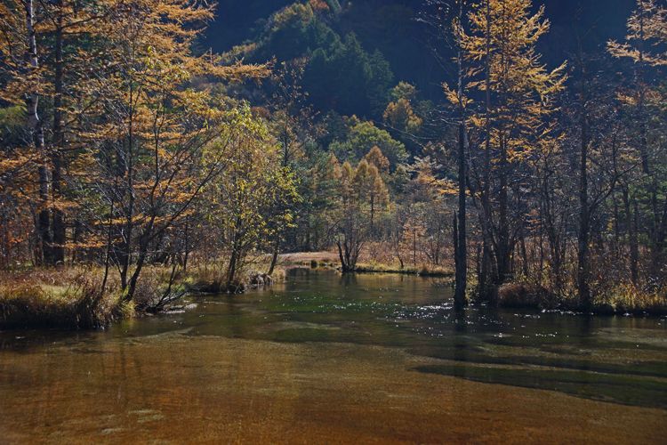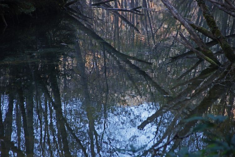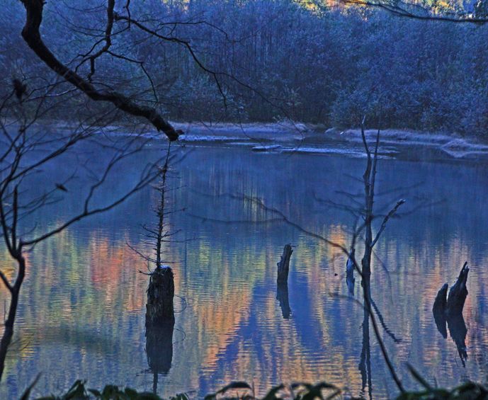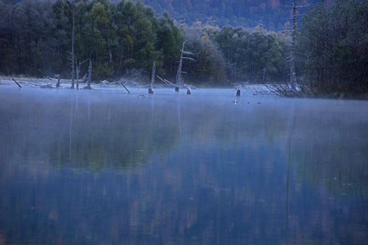 川霧と光の 仕業か 水面に紅葉の木々が 写り