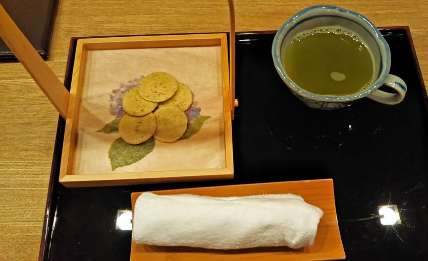 エビ煎餅と 湯茶です 香ばしかったです
