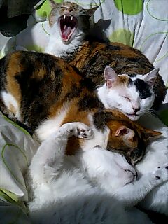 怪獣 なぁ ♀4才です。外は北風が唸りながら吹いてるけど、窓際はガラス越しのお日様サンサンです。これ、× 4 固まってるのわかりますか?