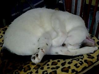 手前に飛び出しているのが 左 前足 で、枕にしてるふうなのが 右 後ろ足 です。