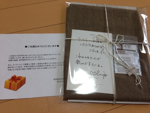 「Maymeスタイル大人のふだん着」 のwebアンケートに当選しました。包装もかわいい。その上手書きのメッセージまで。毎月5名にみちよさんのセレクトしたグッズが当たるそうなので、他の方は何が送られてきたのかな?気になる~。私のとこには、この作品のウォームリネン起毛 のはぎれだと思います。素敵な生地です。わたしもこの生地でコートに仕立てたい。伊藤みちよさんが洋裁指導なされた映画のパンフレットも入ってました。幅広く活躍なさっていて、ほんとに素敵で憧れます。いつまでも応援してます。ぽちっていただくとうれしいです→にほんブログ村