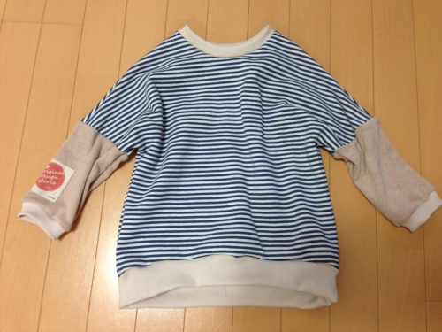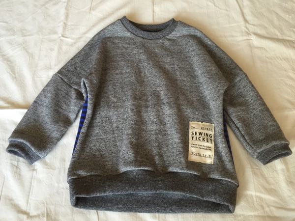 toco.さんのプルオーバー1103日連続で作りました。やっぱり好き。こちらと同じような配色になってしまいましたが、身生地は裏起毛のボーダーの裏毛で、リブともにcosmoさん。袖部分は猫の隠れ家さん。タグはbasic Plusさんでいただいたものです。着画とってみました。ちなみに参考までに、身長106体重14キロです。↓ぽちってくださると、はげみになります。にほんブログ村