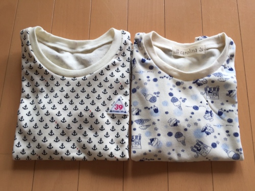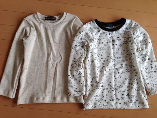 toco.さんのまいにちTシャツ110 長袖バージョン生地は、rickrackさんのカラーーネップのスムース(左)Basic PLUS+さんのマルチスラブリバー天竺 星くず柄(右)を使いました。どちらも生地自体がかわいいので、シンプルに後ろのタグのみにしました。↓ぽちってくださると、はげみになります。にほんブログ村