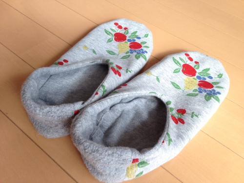 polkadropsさんのルームシューズ作ってみました。表に見える生地はrickrackさんのフルーツバスケット柄の(ダンボールニット)ラグプル→☆で使用したはぎれでかかとと底にはcheck&stripeさんのコットンのフリースその他はガーゼ裏毛で。当方は足のサイズが22.5~23なのでだいぶ大きく仕上がりましたが、普段厚めの靴下をはいているので脱げずにはけます。次はもう少し小さくなるように厚めの生地を使ってみようと思います。↓ぽちっとしていただけるとはげみになりますにほんブログ村