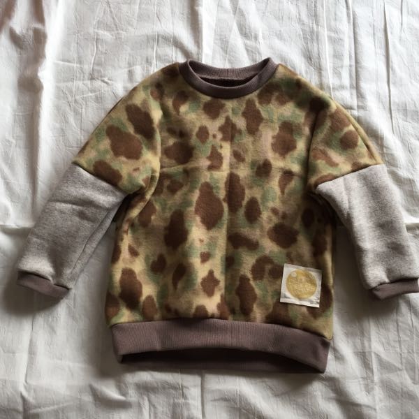 toco.さんのプルオーバー120。2着目。生地は、cosmoさんのカモフラ柄のフリースを使用しました。袖の切り替え部分(rickrackさんオリジナル杢糸シリーズの裏起毛)とリブは共にrickrackさん。杢糸シリーズは、合わせやすいです。rickrack さんオリジナルの生地は、外れがないです。タグはBasic Plusさん。↓ぽちってくださると、はげみになります。にほんブログ村