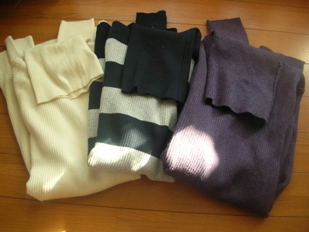 またまた、GAPでリブタートルを買いました。オフホワイトとグレー×紺のボーダー、グレー×黒のボーダーの3枚。定価は1枚5200円。先日紫を買ったときは1枚2900円、今回は一枚1900円!さらにレジで20%オフ3枚買っても5000円しませんでした。たぶんもうちょっとしたらまた安くなると思ったけどいい色は早く売れちゃうんです。もう紫はなかったしね。写真はグレー×黒のボーダーのかわりに紫を。あと、HUMAN WUMANで麻のカーディガン、ラルフローレンの紺色の半袖ティシャツ(二つとも春っぽい)、vert danseでグレーの半袖ジップを今年に入ってからバーゲンで買いました。半袖ジップはちょっと年を考えると無理があるけど大好きなんです。だめだったら上の娘にあげようかなっと。ラルフのティシャツは子供服の160サイズのです。自分が欲しくなっちゃって。冬物のバーゲンは定価が高いのでなかなか、大物が買えません。ダウンがほんとは欲しいんですが。ブーツも欲しいし。バッグも欲しい。欲しいものばっかり。娘には年末に紫、黄色のヒダスカートを2枚作ってあげたので、長袖ティシャツを1枚KLCで買ってあげました。上の娘は年末にベストとロングカーディガンを買ってあげてます。気に入った物は良く着るので、バーゲンでも割と早めに買います。安くても着ないともったいないですから。