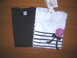 ユニクロでかわいいプリントティシャツを買いました。長袖なのに1500円。手書き風のボーダーにピンクのバラ+りぼん、、、年を考えたら(また)買えないけど、上の子が気に入れば2人で着れるかなと思って買っちゃいました。ユニクロのネットショップでも売っています。さらにLEEの100人隊のお買い物ブログで同じ物を買っている人がいました。よく自分の年を忘れてかわいいのを買いたくなって困っています。先日作ったグリーンのフレアーセーターは下の娘にばかにされ、上の娘に気に入ってもらえて無事、娘の服になりました。隣に写っているのは先日買ったプチバトーのティシャツです。実物はいい~色です。くすんだ濃い紫色。ほかの形のも欲しいな。★sale 30%★ F-PB73248-58 Lady's ポワンココット半袖Tシャツ ブラウン petit bateau プチバトーPETIT BATEAU(プチバトー) タートルネック長袖 74055 ブラウニー送料無料★%OFF!ジャンル大賞受賞記念SALE♪激安セール開催中!!【2008AW新作入荷!】 プチバトー 74052 クルーネック長袖カットソー 54(ラピスラズリ) S(14ANS) )(long)