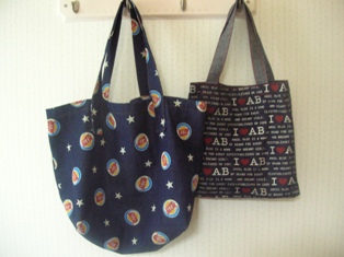 子供のブランド生地が SUNNY SIDE で売っていたときにたくさん買いました。子供のパンツにするには硬い生地だったのでバッグにしました。生地の端を赤のバイヤステープでくるんだのがお気に入りです。(笑)あ、型紙はないです。適当に作りました。
