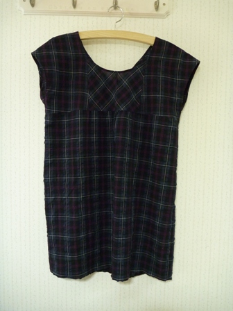 スクエア切り替えチュニック2着目できました。型紙はクルールさん。布はたぶん大塚屋。(去年娘のワンピースを作った残り)1着目のは私には襟が開きすぎだったのでちょっと前にギャザーを入れて1~2センチ縮めて見ました。ちょうどいいあき具合になりました。後ろのスリットは閉じてリボンも付けていないのでシンプルです。サッカー生地なので涼しいです。