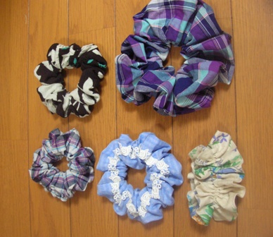 ハギレと言うにはちょっと大きめの残り布でシュシュを作りました。最近作った服の残り布です。綿麻の花柄のシュシュはLEEで載っていた寸法で作りましたが、いまいち私の好みではありませんでした。なので雑誌の付録に付いていたシェルのシュシュの大きさを参考につくったのが一番大きいのです。他は少しずつ小さくしていきました。