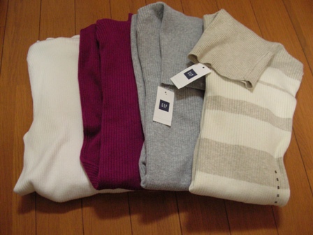 私の定番のGAPのリブニットタートルを5200円のところ1900円で買いました。ちょっと前に2900円になっていたのですがちょと我慢して1900円。今年は安くなるのが早いです。ユニクロのフライスタートルも持っていますがこっちの方が断然お気に入り。高いけど。8000円以上買うと明日から12月9日までの20%オフのホリディパスがもらえます。子供服も買ったので一万超えたのですが、8000円ちょっと買って子供服は明日以降に買えば700円以上は安くなったはず、、、しまった。じっくり張り紙見ればよかった。茶色の服は私が着たいくらい気に入っていたのですが次女も可愛いと言ってくれたので即決。タートルもついでに。これもユニクロより高かったのでちょっと後悔。物がいいと信じましょう。自分で作ればもっと安いけどね。寒くてミシン部屋にいけない。寒くなる前に冬物は作らないとだめですね~。