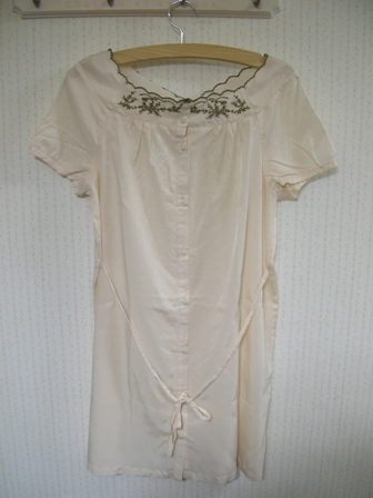 イオンのショッピングモールでタイムバーゲンをしているお店があり試着もしないでワンピースを買ってしまいました。綿との合繊なのでちょっとてろっとしていますが襟の刺繍が可愛いです。1000円。一枚では可愛すぎるので重ね着で。前後ろがよくわからなかったので店員さんに訊いちゃいました。最近安い物しか買ってないですね~。世の中デフレになって大変になるかもしれないのにね~。