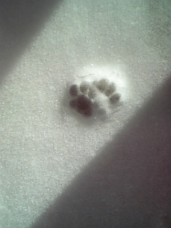 今日は、朝普通に起きて、果物食べてお茶飲んで、猫グッズを中心にリビングの片付け。レオの毛がからまっている毛布やシートやクッションの徹底的掃除。そして、お洗濯、 不要物の処分で、午前中が終わってしまいました。午後は、力尽き (軟弱) 昼食後は、レオと30分位昼寝してしまいました。子供時代のことは、時々考えますが、今思うと、本当に堅苦しく育った気がします。今は、あまり物を考えずに、好きなことを自由に話し、考えてないから、アホなことを言ったりして、すぐ撤回しなくてはならないこともありますが・・・子供時代の方が、思考先にありき、でした。そんな自分が嫌だったのよねぇ~だから、結構年齢が上になってから、子供をやりなおしているようなところがあります。取り戻そう、というのではなく、新しく作ってしまうような感じです。バカバカしいことをしたり、失敗をたくさんしたり、失敗を他の人に話して笑われたり・・・そんなこと、今楽しんでいるところです。子供の頃にできてたら、逆だったのかな?あなたが、作りなおしている子供時代、何かあるでしょうか?雪の上をちょっとだけ歩いた、あみちゃんの足跡です